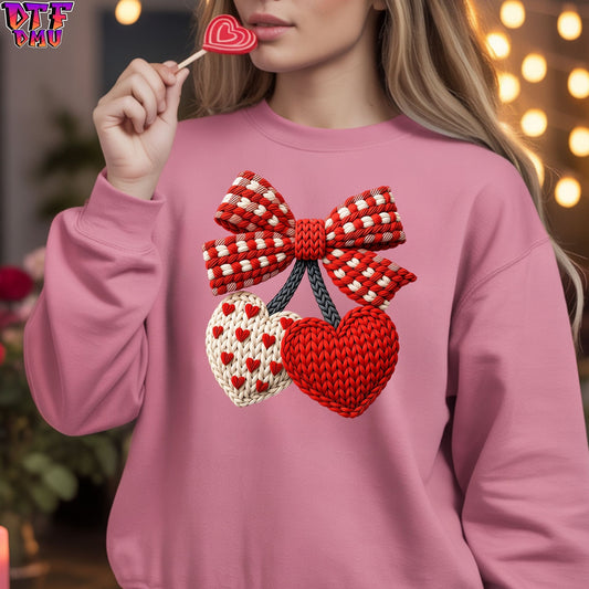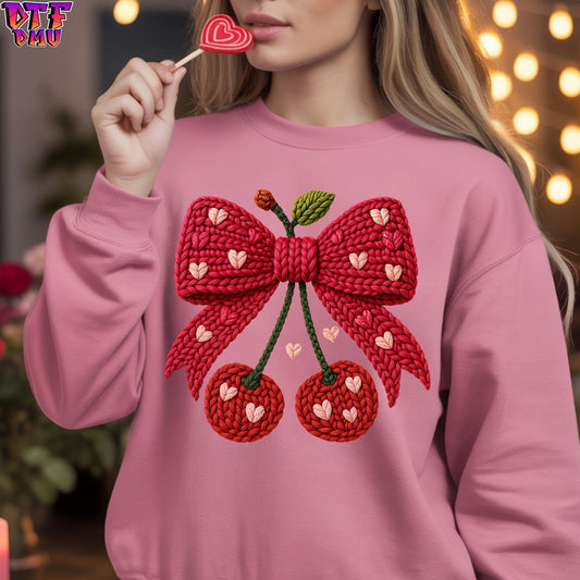 Cherry Bow Valentine's Day Faux Yarn/Crochet DTF Transfer Print Only.