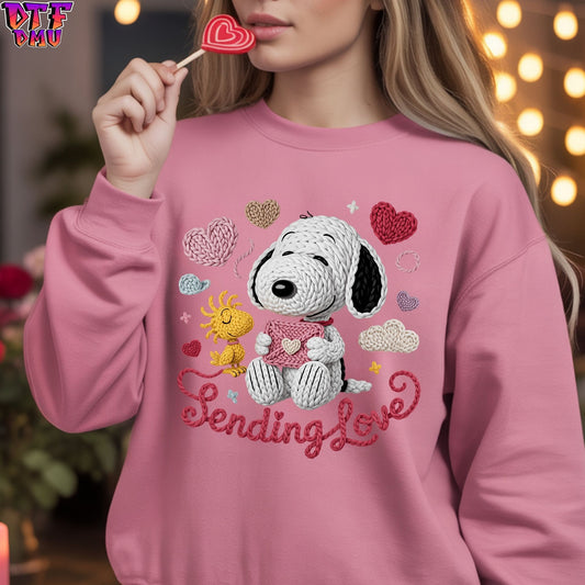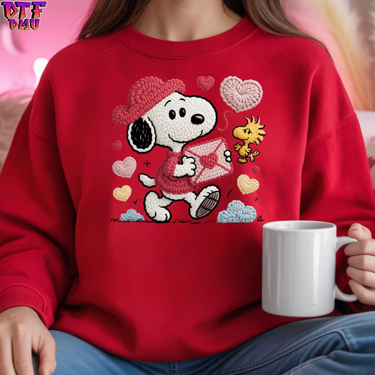 Snoopy Sending Love Valentine's Day Faux Yarn/Crochet DTF Transfer Print Only.